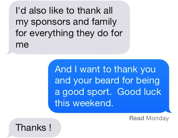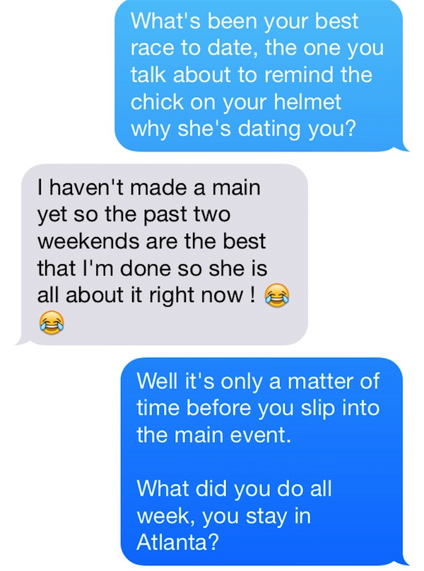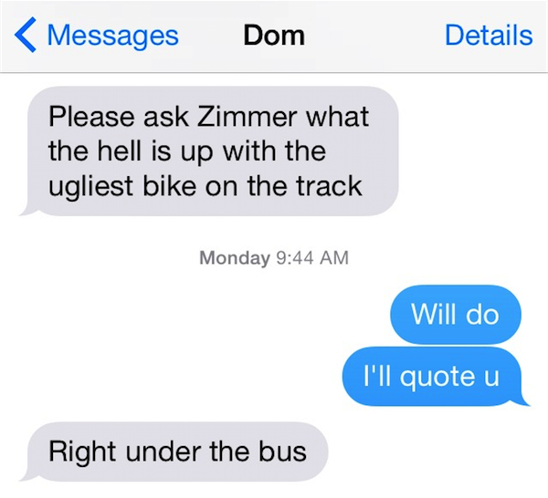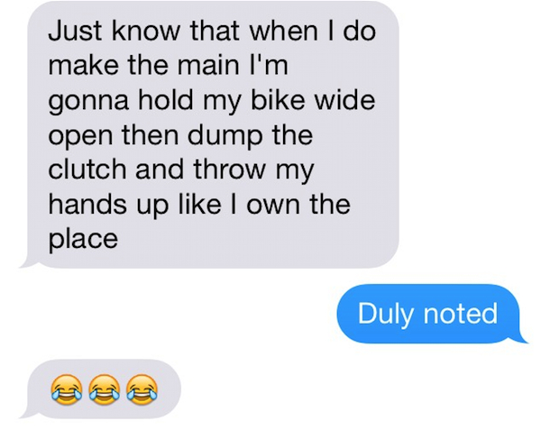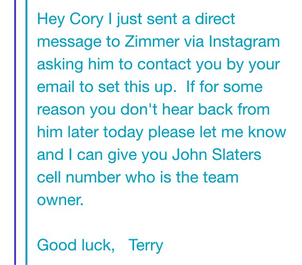 As you might have realized by now, I didn’t get the Zimmer interview. It wasn’t from a lack of effort or planning, as you can see I text him on Monday. I was offered his phone number by one of my “sources”, but a Mr. Steve Matthes had already provided me with vital information. Well, I’m going to be contacting my “sources” to track down Mr. Zimmer, because I never got a response. I was likely provided false information from Matthes… thanks boss. I have been turned down by riders before, so this is nothing new. I like it when they play hard to get… game on Mr. Zimmer, game on. Hey Terry, I need that number now buddy!