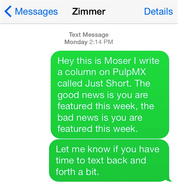 Zimmer has actually been featured in Just Short before, apparently three times. Feel free to click on the links below to read my previous articles on Mr. Zimmer, or just read the quotes I pulled. I don’t go back and read what I write very often, but I should because I’m pretty funny…
