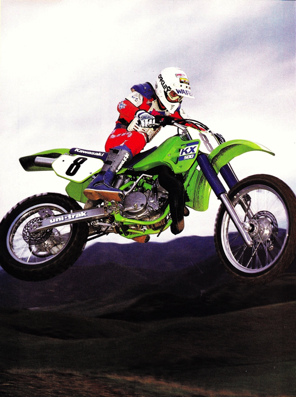 In 1988, the new KX500 offered by far the best motor in the class, with every bit as much power as the tire-scorching Honda, but far less drama. The KIPS system allowed Kawasaki to tune the big green machine for broad and smooth power that allowed riders to actually use all of its prodigious output. It was the only 500 to actually offer usable power in all three fazes of the power curve and pulled with authority from bottom to top. It could be short-shifted or revved out with equal effectiveness and proved versatile enough for both motocross and high-speed desert work.