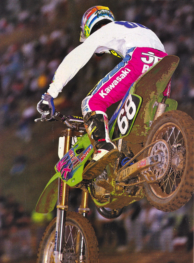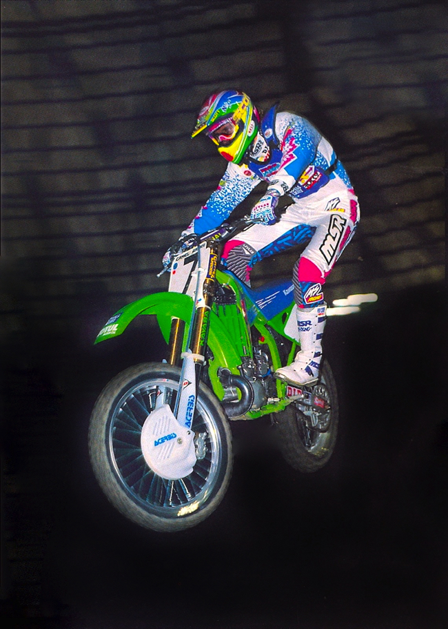 In the eighties and early nineties, it was quite common to have your top guys race the 250 class (then the premier division) indoors and then drop down to the 125’s outdoors. In 1992, Kawasaki’s latest hire Mike LaRocco opened the season by winning the first round in Orlando on his Factory Kawasaki KX250. Come March, Mike stepped down to the 125 class to battle the kids on his KX125. Photo Credit: Dirt Rider Magazine |
