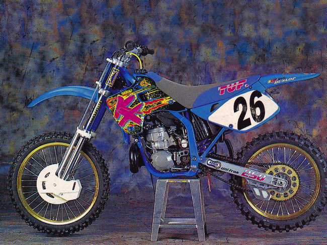 In the early nineties, the aftermarket motocross graphics movement exploded in popularity. Any number of companies offered ways to turn your KX blue, RM pink or your CR green (with outlandish graphics to match). One of the early pioneers in this arena was Illinois’ Tuf Racing, which became well known for campaigning orange Kawasaki’s with Keith “Bones” Bowen at the controls. Photo Credit: Dirt Bike magazine