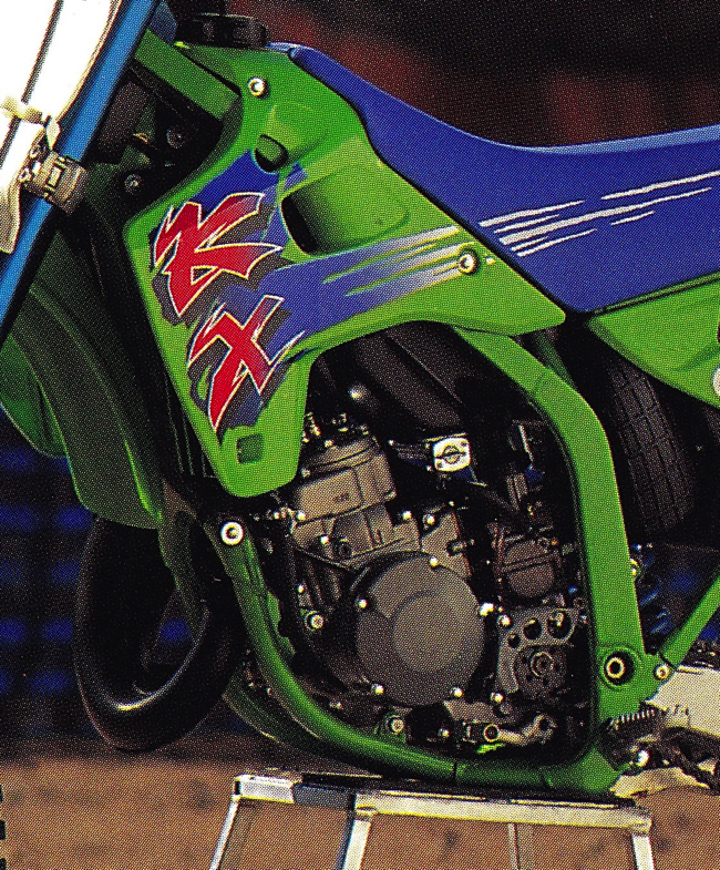 For 1992, Kawasaki spec’d an all-new motor for their eighth-liter racer. The new 124cc mill used a longer stroke and larger carb for ’92 to produce a wide and very useable powerband. Not as outright fast as the CR or lighting quick as the RM, the KX’s motor was broad and easy to use, but not particularly thrilling to ride.