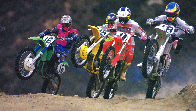 The 125 crop of 1992 offered a varied and potent selection of machines to fill your racing needs. The Kawasaki, Suzuki and Honda all had their proponents, with only the woefully underpowered Yamaha struggling to find supporters. Photo Credit: Dirt Bike