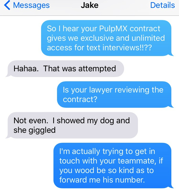The PulpMX sponsorship of Jake Weimer is already paying off in great dividends, providing me with exclusive access to his teammate Dakota Tedder this week. In depth data analysis and target group studies have shown nobody cares about the 250F class. I have to respect what the readers want, so moving forward, I’ll only have an honorable mention and tip of my hat to the rider that comes up Just Short in the 250 class.