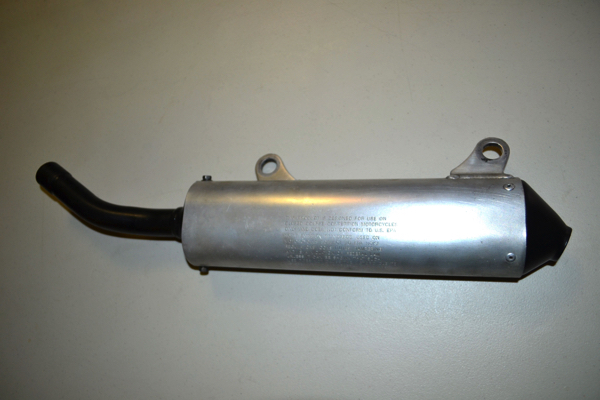 The silencer thing is always a problem on classic bikes. Back in 1990, aftermarket silencers had trick turned-down stinger tips. Unfortunately, the FIM saw fit to ban them in the late nineties (A move that made no sense to me in light of the spinning buzz saw attached to the rear wheel, razor sharp pegs we stand on and scorching hot motor. I mean seriously, the stinger is the thing that they think is dangerous!?! ) so any silencer you get now looks odd and out of place on an old bike. Thankfully, the Factory bikes actually ran modifies stock silencers on the works bikes in 1990, so sourcing a suitable replacement was not too hard. I scored this lightly used stocker for peanuts on eBay. |
