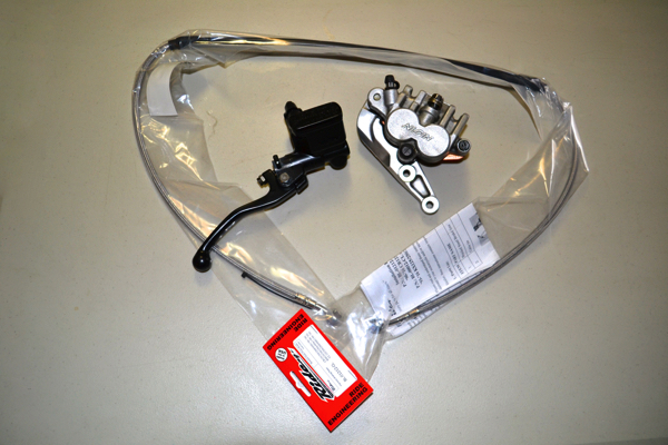 As I mentioned in installment one, the brakes on the CR were pretty grim as delivered. There was no bite at all and a pretty crappy feel overall. In an effort to bring back a little pucker power, I found a compete 1994 CR250 front brake assembly on EBay for $20. The 1994 master cylinder uses a shorty lever that can be adjusted for reach (something I sorely missed back in 1990) and has a traditional banjo fitting instead of the odd threaded line the ’84 -’91 CR’s use. This meant I could use a braided steel line from the guys and gals at Ride Engineering to reduce the spongy feeling at the lever. |