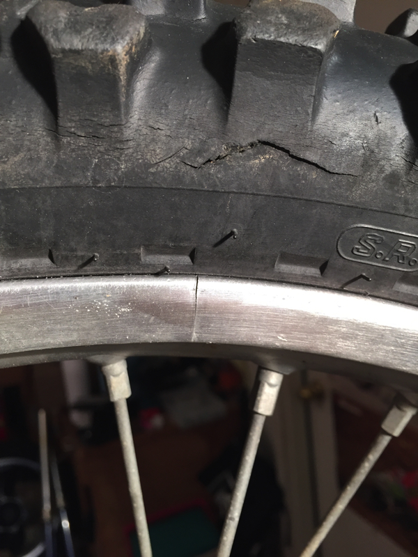 As I mentioned in installment 2, the stock rims on these CR’s were pretty suspect and I used to go through them pretty regularly back in the day. Well, once I got around to pulling the wheels off and giving them a good once over, I found this familiar crack in the front one. I was already planning to have Dubya lace me up new ones, so this was no major blow to the project. |