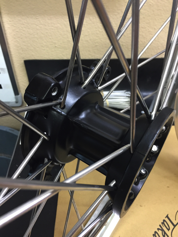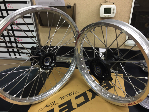 Since I was going for a Factory replica look on Project 90, I decided to stick to silver rims and spokes with black hubs. John Anderson at Dubya USA hooked me up with a new set of Takasago Excel rims, spokes and nipples and mated them to the stock hubs. I stuck with the 18” rear out back, but I certainly could have gone with a 19”, as that is what the Factory team ran in 1990. |