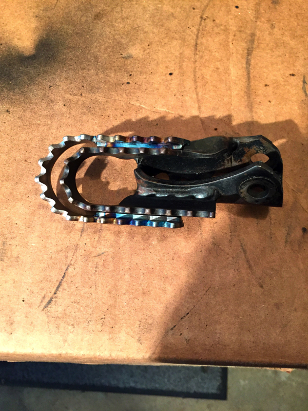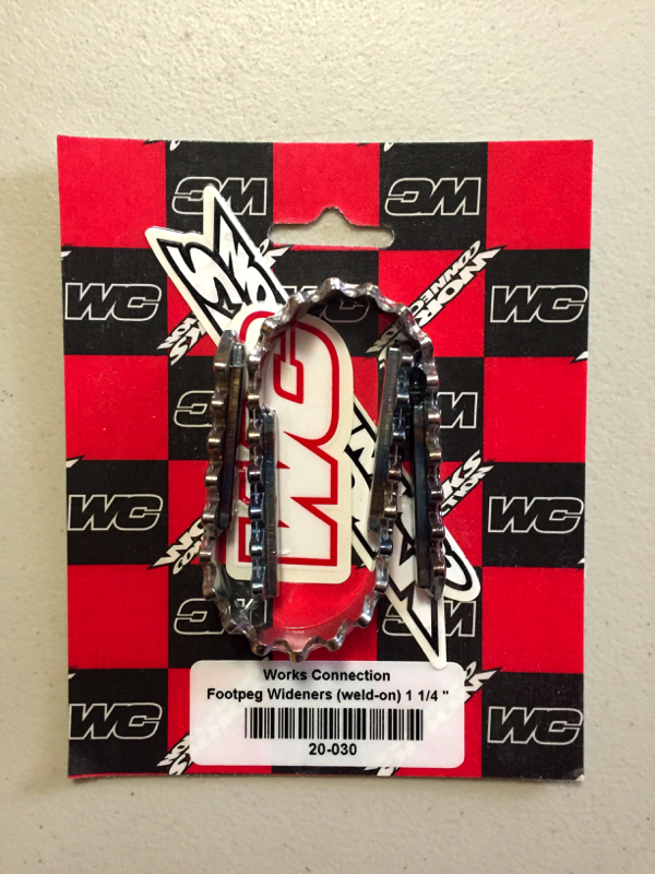 The Works Connection wideners increase the length and width of the stock pegs and give the bike a more modern feel. Trust me, you will be glad you got them the first time you come up short on something. |
