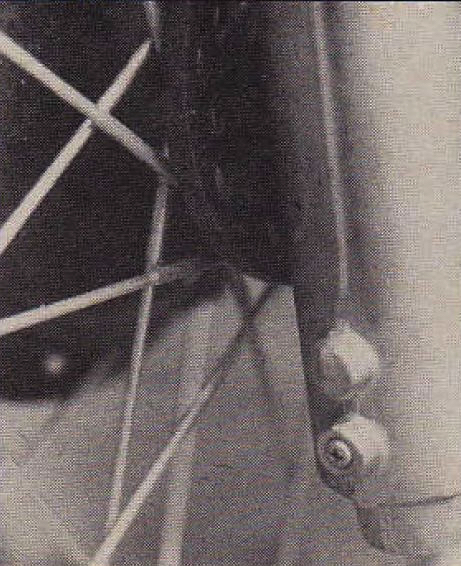 Seeing double: One odd side effect of adding 20mm to the forks internals was this weird dual nipple at the bottom of each leg. Instead of casting all new sliders, Yamaha reused the ’77 components and just added a second bleeder screw below the first. |