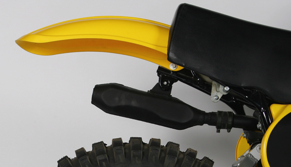 The stock silencer on the YZ400E was steel, non-serviceable and loud as hell. While suitably obnoxious, it was not any worse than the larger, but no less cacophonous unit found on the Suzuki RM400. |