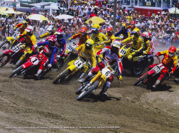 While not particularly easy to ride, there was no denying than the YZ400E made major power. Here Rocket Rex Staten (6) and Rick Burgett (14) power their Yamaha’s to the front of the 1978 St. Petersburg 500 National. Photo credit: Dick Miller Archives |