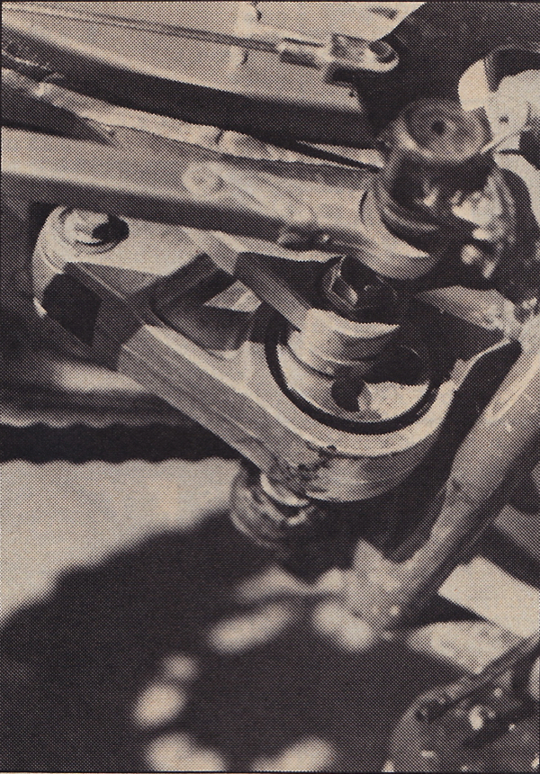 While the new Full Floater accomplished both of Suzuki’s design goals, it missed out in the most important department – performance. The new rear end offered 12.4 inches of travel to go with both compression and rebound damping adjustability and a more compact layout. While less complicated than previous Floaters, it also proved less adept at taming the track. Harsh and unforgiving, it was too stiff on small impacts and transmitted every part of the track to the rider’s backside. Big hits were taken well, but the compression and rebound damping were too heavy in both directions. Making matters worse, the linkage proved prone to a great deal of drag. The stiction in the eccentric cam was bad enough to actually interfere with the shock’s movement and hinder the Kayaba’s ability to react in the rough. As the linkage broke in, this draggy feeling lessened slightly, but never completely went away.