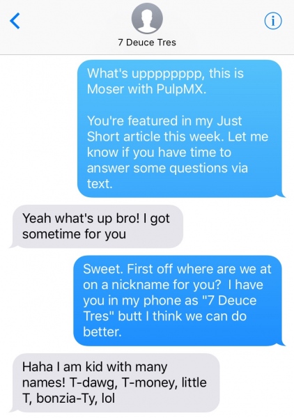 Seven Deuce Tres is starting to figure this SX game out. Seven Deuce Tres is starting to figure this SX game out. Photos: James Lissimore T-Dog is no longer in the shadow of his rapping brother. We couldn’t track down J-Law err…Surratt. CLMoser