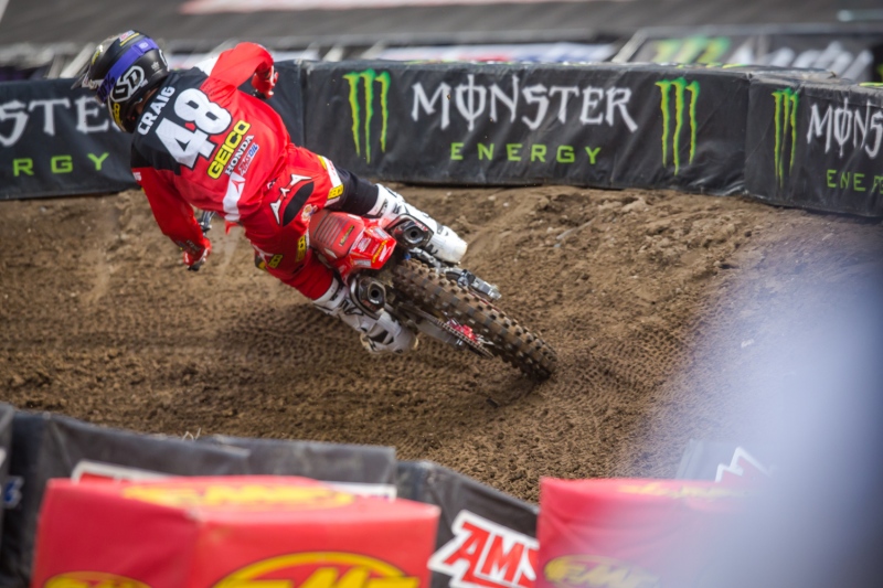 Once again, I like that part of the racing. You have to adapt to the track changes and your lines and combos have to evolve with it. It obviously gets more chewed up because the 250 main was 4 laps longer and the 450 was 6. That’s when you have to use your head and make some changes. For example, after the sand in the beginning of the 450 main, the outside was better. Towards the end of the main, the inside rut, even as deep as it was, was faster. In the whoops, skimming them early in the race was ok but jumping them at the end was better. As for the dangerousness of the track at the end of the mains, you have to make the best decisions. Not Saturday because everyone jumped everything the whole race but some races the big rhythm sections won’t be able to be jumped the whole race. Riders have to be smart about it and not take too many chances when the track gets really rutted.