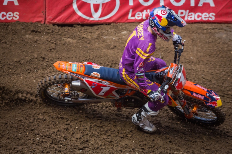 On some tracks it will help to be fearless and a little reckless to win races. It all depends the degree of danger the riders can deal with. Technique and riders’ skills to deal with ruts also come into play. Riders bitch when the track isn’t what they like, they bitch about small whoops, big whoops, ruts, no ruts, lappers and on and on. I think the track breaking down is great for skilled well-trained riders. Tomac and Musquin are the proof of it this weekend… The bottom line is that SX is dangerous and if you don’t like it, join a bowling league. If we make SX safe and mellow, we’ll get races like the SMX in Germany. I don’t know if you guys liked that but if US SX becomes that, I will never watch a SX race ever again…