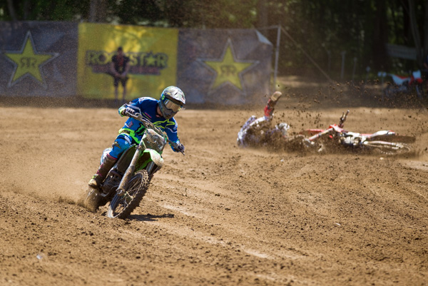 | Jacob Hayes(with Wright crashing in the background) had a so-so day at Gopher. He dropped out of moto one with shock troubles and grabbed a fifth in moto two. |