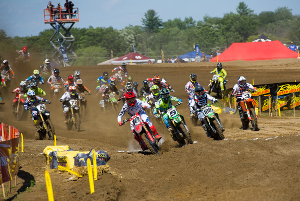 | Colton Facciotti(10) and Mike Alessi(5) battle for the holeshot in moto one of the MX1 class |
