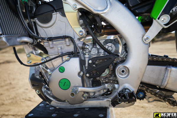 The Kawasaki engineers worked hard on the engine to try and keep pace with the KTM and Yamaha powerplants, making changes to give the KX250F’s single-cylinder, DOHC, water-cooled, fuel-injected, 249cc engine more torque and increased power without reinventing the whole engine. The KX250F’s bore and stroke are the same as before, 77.0 x 53.6mm, but Kawasaki changed the compression ratio by lowering it from 13.7:1 to 13.4:1—less compression can make it easier for an engine to rev higher. Added compression can give you more torque, but make it rev not quite as far. Kawasaki also worked on the KX250F’s Keihin fuel-injection system. A new, higher-flow intake boot is fitted on the machine and a new 43mm throttle body places the dual injectors straighter at the intake by rotating them down to a 30-degree angle instead of the 45-degree angle like on last year’s model. Additionally, Kawasaki added a new fuel pump that is claimed to increase fuel pressure by 17 percent.