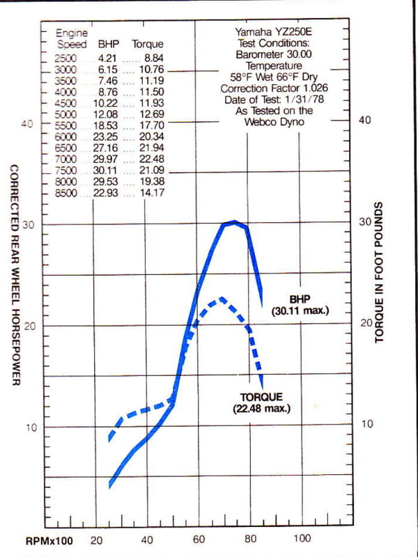 This dyno curve gives you a good look at just how abrupt the new YZ’s power was. From 5000 to 7000 rpm, it jumped from 12 horsepower to nearly 30. The new mill did provide a full two horsepower more than ’77, but that performance came at the cost of some ridability. Photo Credit: Cycle Magazine |