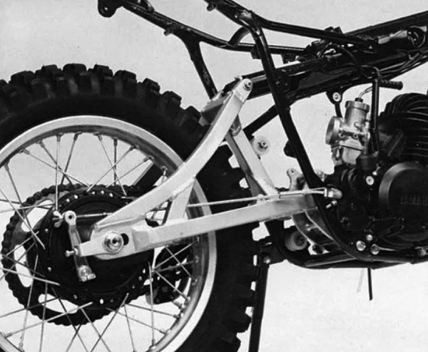 One of the major problems facing early long-travel suspension designs was how to keep the chain from derailing as the suspension moved through its arc. Engineers had yet to work out the importance of having the countershaft directly adjacent to the swingarm pivot and instead relied on a complex combination of rollers and tensioners to keep the chain from going slack. Photo Credit: Yamaha |