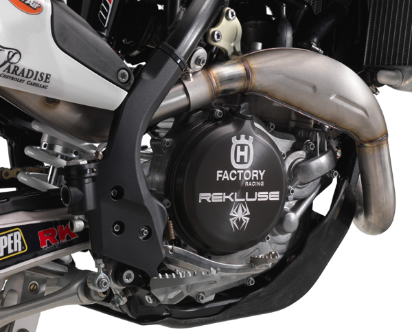 The FC 450 ROCKSTAR EDITION features a DDS (Dampened Diaphragm Steel) clutch. The exclusive characteristics of this system include a single diaphragm steel pressure plate instead of traditional coil springs. It integrates a damping system for better traction and durability. The clutch basket is a single-piece CNC-machined steel component that allows the use of thin steel liners and contributes to the compact design of the engine. The billet clutch cover is exactly the same as the one used by the Rockstar Energy Husqvarna Factory Racing team.