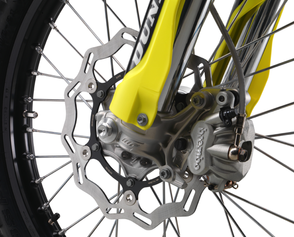 The standard of brakes in motocross is Brembo, we all know this. The 260 mm now floating front and 220 mm solid rear discs is there to deliver superior stopping power instilling confidence in any condition. A standard front disc protector is fitted as standard.