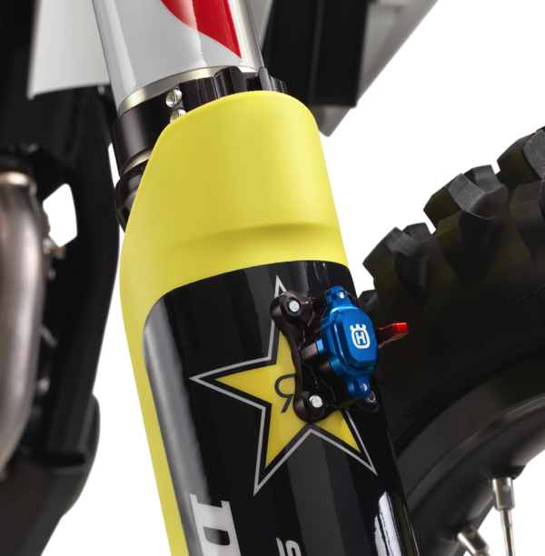 The 48 mm split air fork features a capsuled air spring and pressurized oil chamber. Damping is adjusted via the single air pressure valve for pre-load (on the left) as well as easy access clickers adjusting damping with 30 clicks (on the right). Additionally, the air pump needed to adjust the air pressure in the fork is provided as standard equipment. Standard on the FC 450 ROCKSTAR EDITION, the mechanical holeshot device compresses the front forks and decreases front wheel lift right off the start.