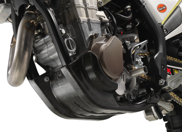 The hydro-formed, laser-cut and robot-welded frame is crafted by WP Performance Systems. Constructed with specifically calculated parameters of longitudinal and torsional flex, the FC 450 ROCKSTAR EDITION frame features an increase in longitudinal rigidity. The frame is finished off in a premium black powder coating. A carbon fiber reinforced skid plate and frame protectors are there for protection and durability.