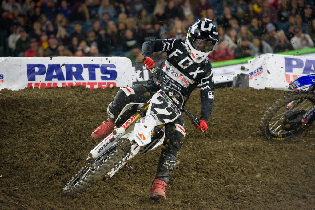Yeah, one of my favorite obstacles on the track, and I went around them all day long. But hey, it is what it is. Honestly so happy to make it here. It feels like a win just to make it, and then transfer directly to the main, and 15th. The Yamaha days when I came off of my shoulder, it was like you had a full head of steam. I was ready to race. Literally I did my shoulder I think the day or two before I was jumping on a plane to go do world supercross. I didn’t lose anything. I never got to train at all. I was starting the Monday after Straight Rhythm. Then I started training and my foot blew up, so that was it. I quit training. I haven’t trained. I haven’t done anything. It’s just been like sun up to sun down, work on the ankle, work on the ankle. We did a good job. I’m really, really happy. Of course, you always want to be better. You always want to ride faster, but for what the situation was I’m really, really happy.