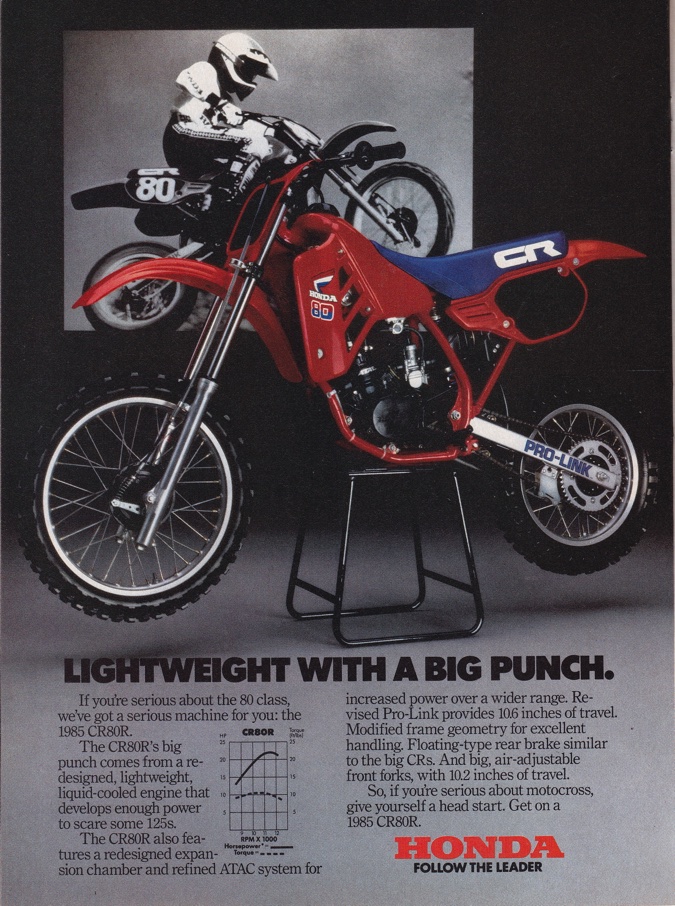 For 1985, Honda dialed up yet another redesign of their mini-class missile. The fourth all-new CR80R in as many years, the new bike featured a revised power plant (still featuring the ATAC), new frame, sleeker styling and updated suspension. While the new chassis finally got the handling right, the rest of the bike continued to lag behind the class-leading Kawasaki. The promised torque boost of the ATAC never materialized and the CR required a go-for-broke approach that most mini pilots could not muster. Compared to the Yamaha and Kawasaki 80s, the peaky Honda was both slower and harder to ride.