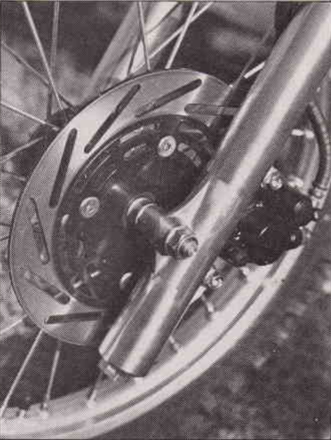 The installation of a front disc was a welcome addition for 1986, but many testers panned the CR’s spongy rubber brake line. Photo Credit: Motocross Action magazine