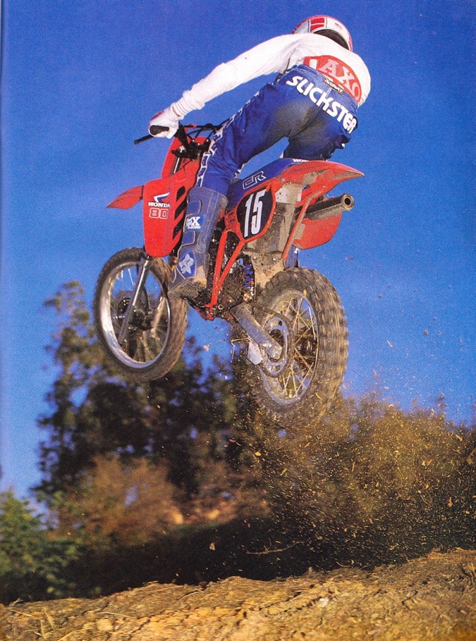 With its potent powerband, slim ergos and light weight, catching air on the 1986 CR80R was a piece of cake. Landings…well that was another matter. Photo Credit: Motocross Action