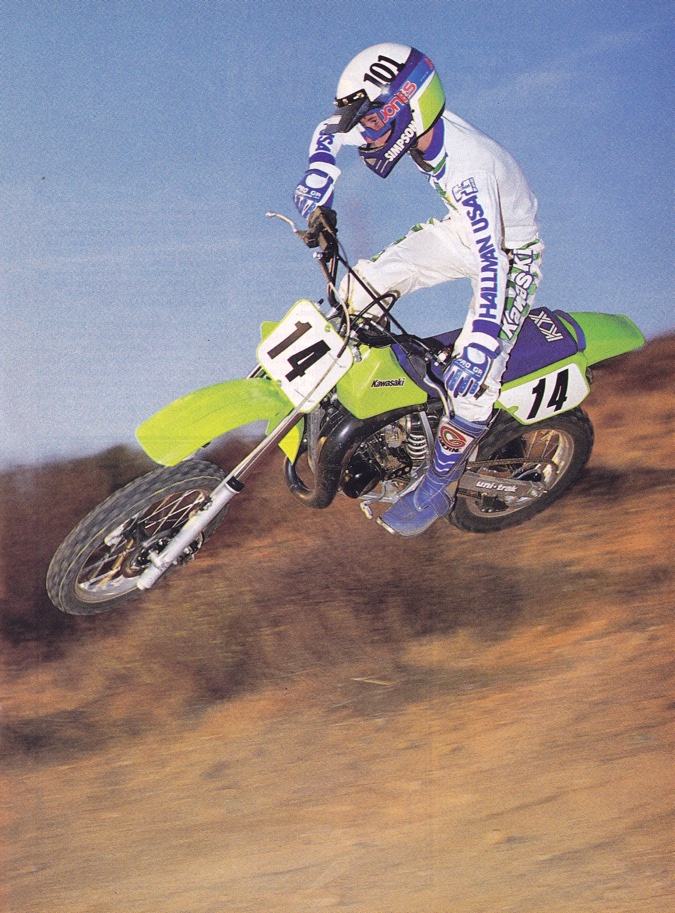 The King stumbles: After dominating small-bore racing for several years, Kawasaki took a major step back in 1986. The all-new KX80 and KX125 traded the broad powerbands they had enjoyed in ’84 and ’85 for an expert-only top end hook that pleased pros, but frustrated novices. Photo Credit: Dirt Bike magazine