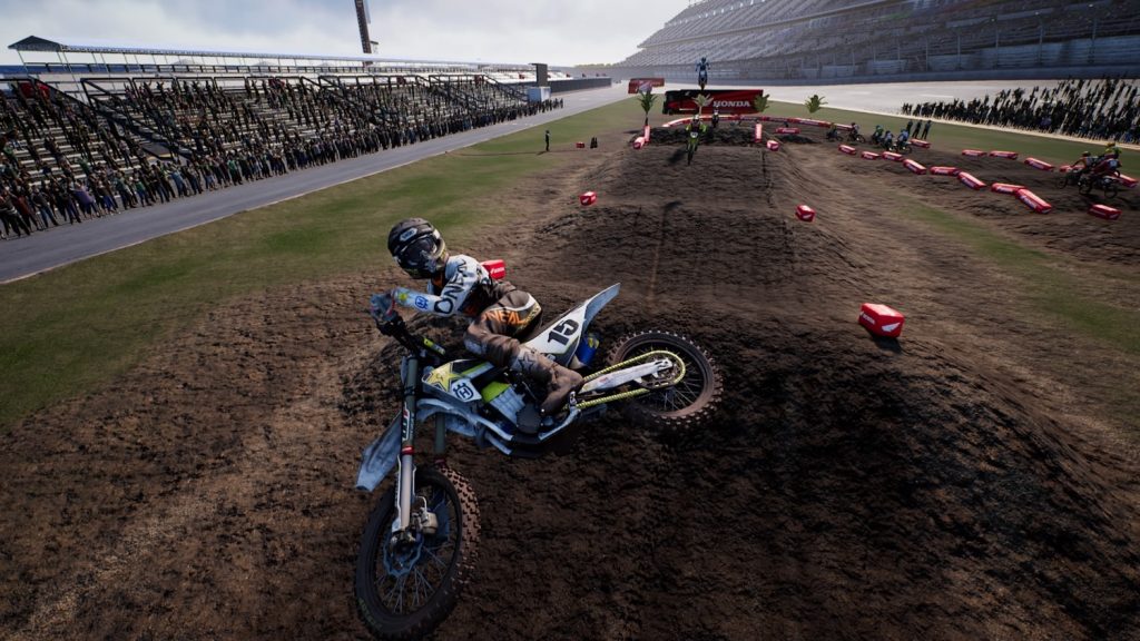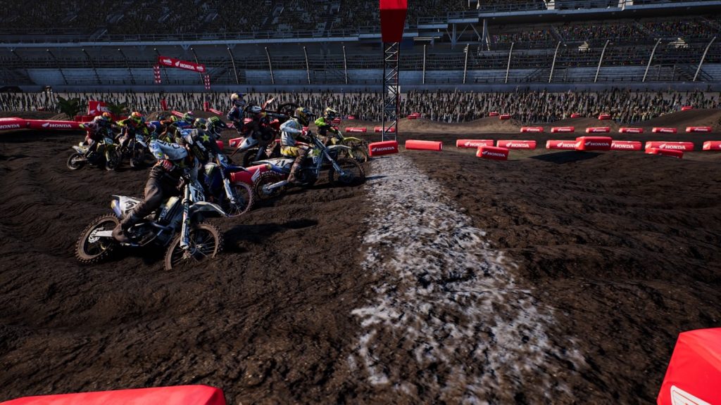 The first thing I noticed were the graphics. The phrase “bold new graphics” takes on a completely new meaning here with realistic looking machines, gear, and stadiums, as well as dynamic rider and bike movements and animations. The rider’s facial models are, uh… not quite realistic, but the helmets and gear look great. And let’s face it (no pun intended), that’s what matters in a Supercross game. On PS4, the frame rate was stable; not perfect, but by and large, stable. There were a few small hiccups going into the first corner with 20 bikes and a lot of carnage, but I’ve never had an experience where a rate drop was so bad that it resulted in lost time or positions. The controls are akin to those of the MXGP series in that the buttons do the same things and the various mechanics operate in a similar fashion, but the bikes now move with more precision, and yet somehow manage to be more stable in the close racing action. Bar banging and block passing are no longer a one way ticket to downtown dirtsville as they often used to be.