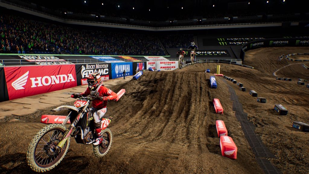 In previous games developed by Milestone, going high into a berm and cutting down frequently resulted in a somewhat difficult to predict amplification of the bikes turning characteristics. This worked well on a motocross track with wider turns, smaller berms and higher speeds, but indoors and at lower speeds, it was very difficult to maintain a consistent line lap after lap. Not anymore. Go high and cut down, rail the outside or just stick to the inside; you’re good to go without any unexpected front-end action. The bike turns in a clean and predictable manner, letting you decide how best to set up for the rhythm or whoop section that comes afterwards.