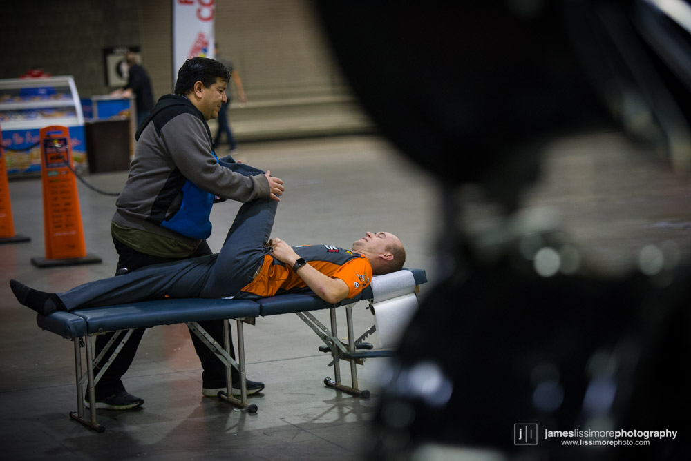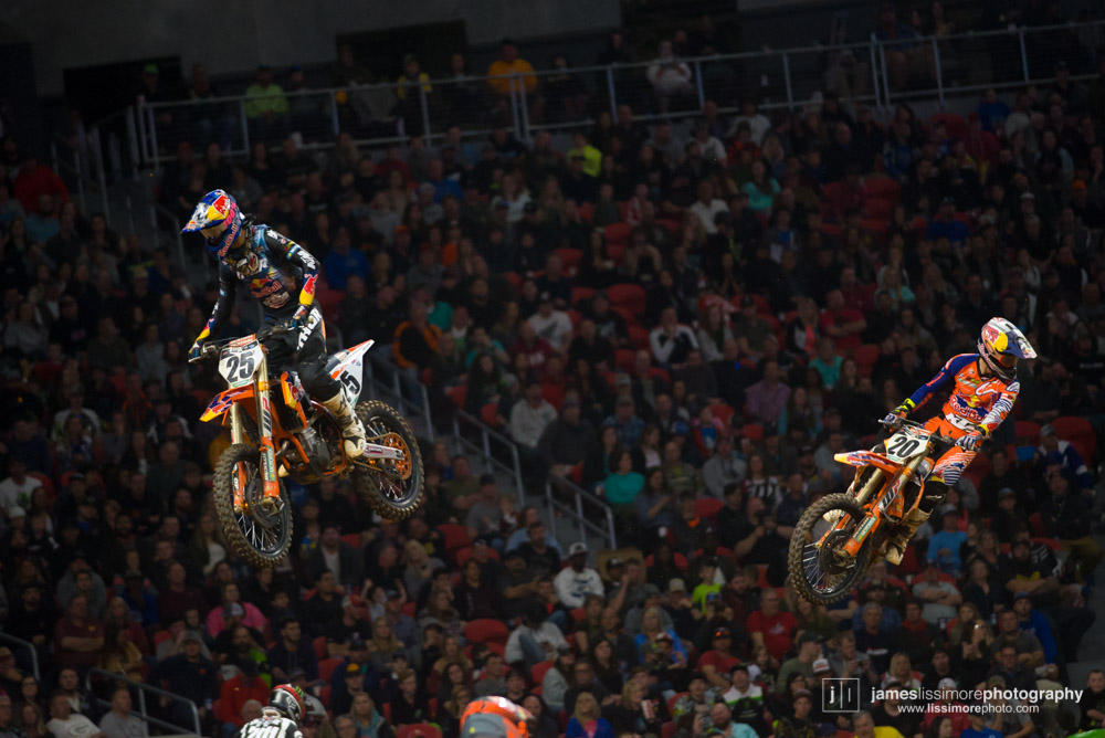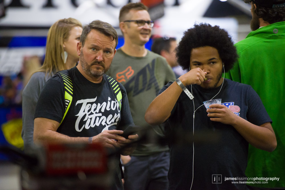These two had very different nights. Broc crashed on the first lap of every main event. He’s probably looking for the anvil right about now in this photo.