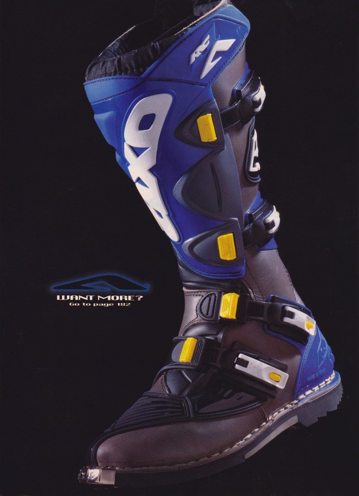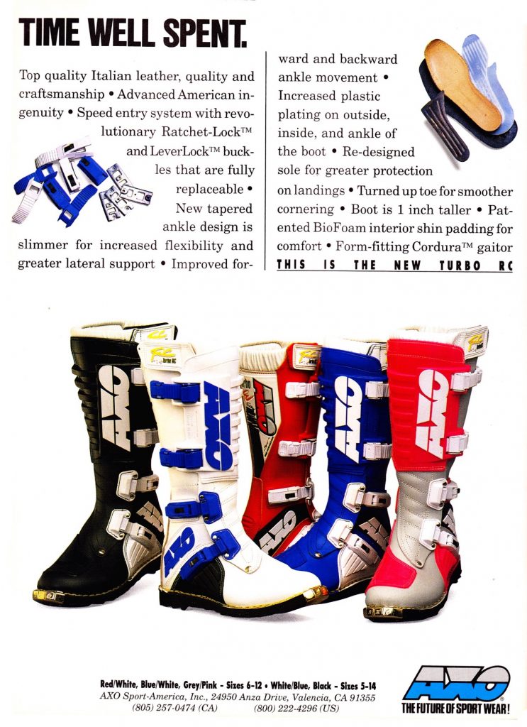 Blaze: Long before they became known for their pants and jerseys, AXO was a boot company. Boots were the core of their identity and the cornerstone of their business. In 1990, AXO introduced the replacement for the wildly successful Turbo Plus to much fanfare. The all-new Turbo RC offered top-quality Italian construction (top-grain leather), better protection (improved ankle support and a 1-inch taller profile) and cleaned-up looks (so good).