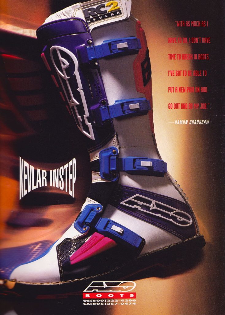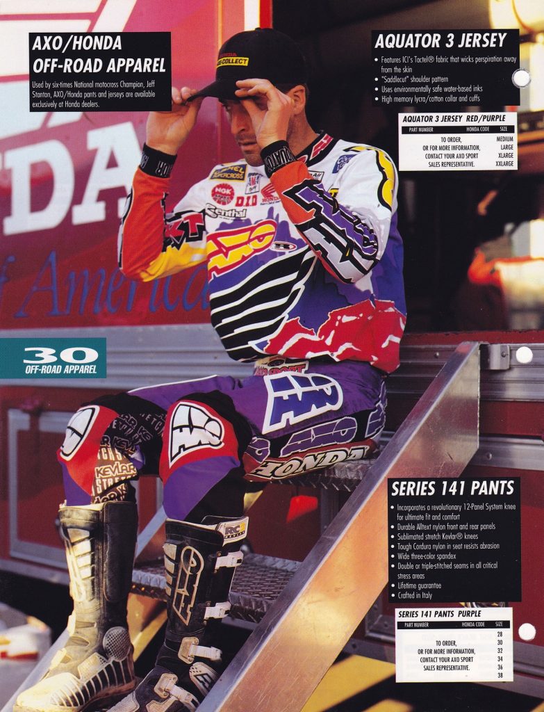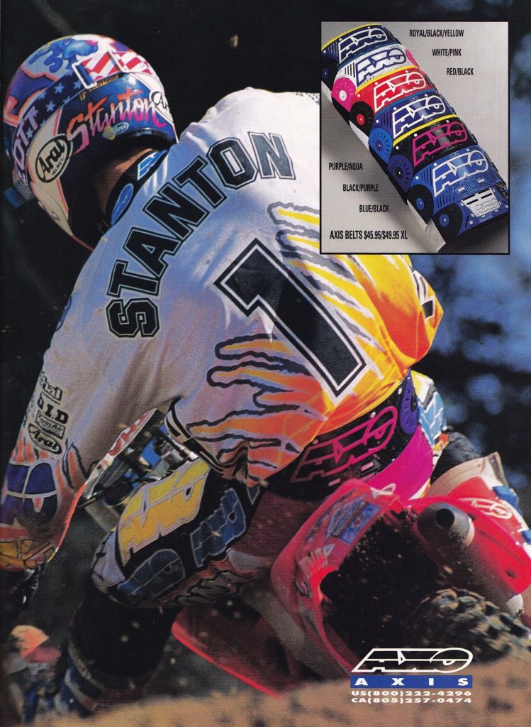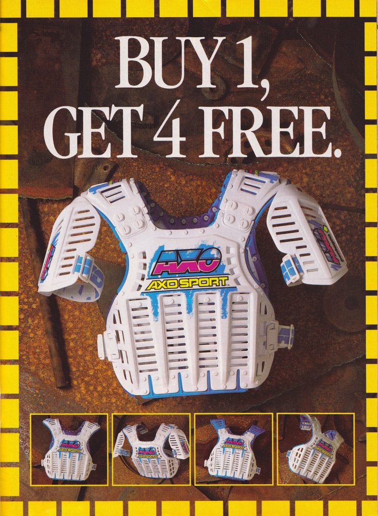 Blaze: Even though AXO was on quite a roll in ’93, not all of their products were big hits. These Limited Edition Series 151 pants featured a weird wrap-around look that I never really cared for. Other than this ad, I have never actually seen a pair of these pants. I don’t think Bradshaw ever raced in them and I certainly never saw a pair in the wild. Thor, O’Neal and JT all tried a similar look at the time, but I don’t think any of them actually caught on with the buying public.