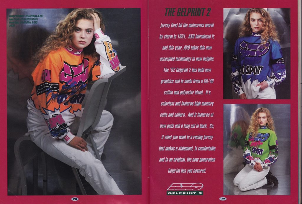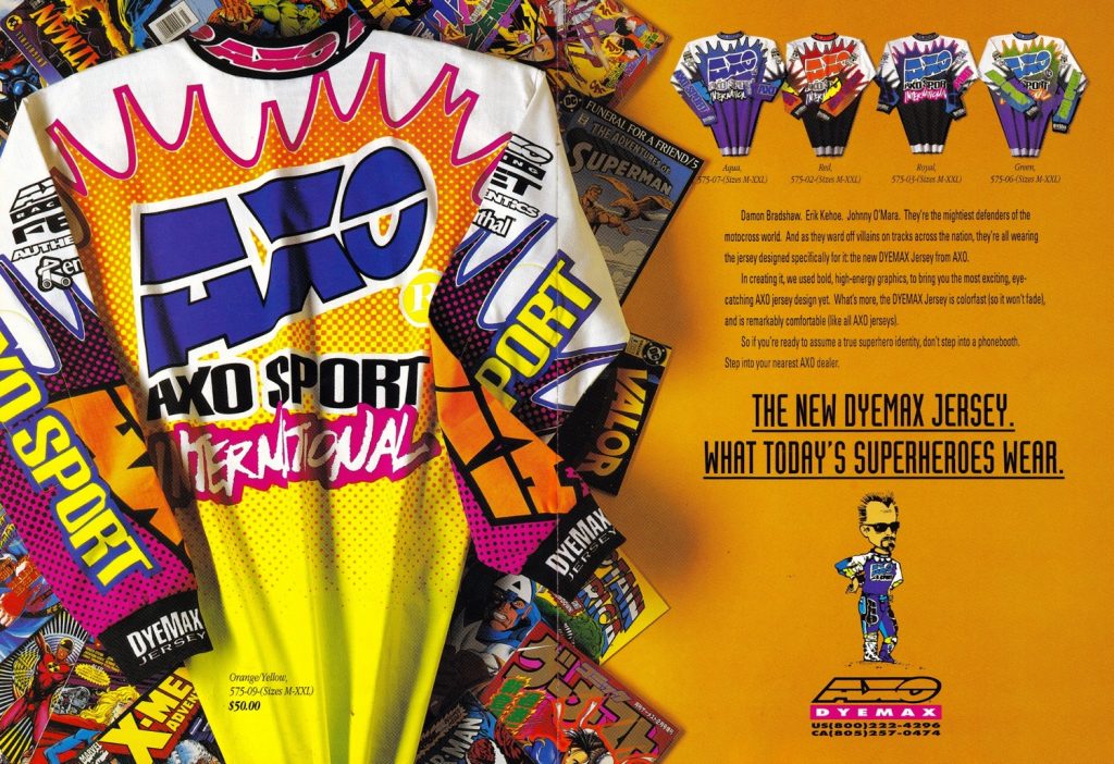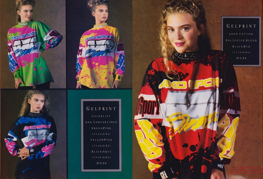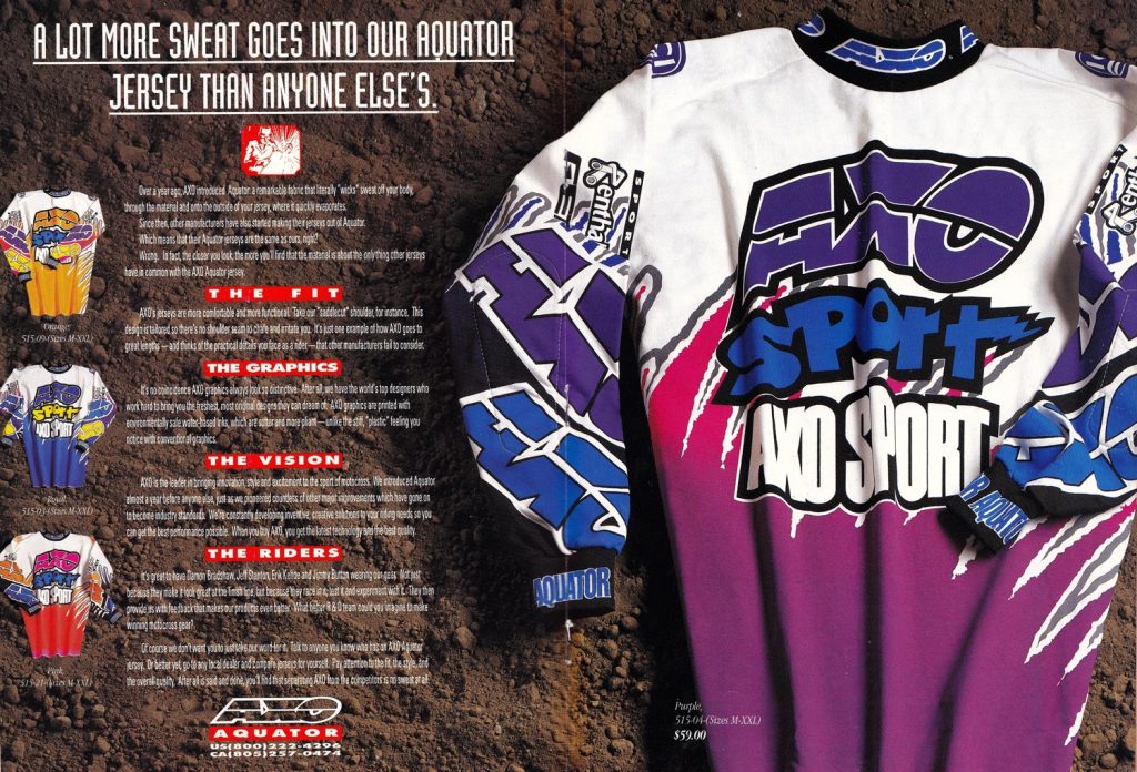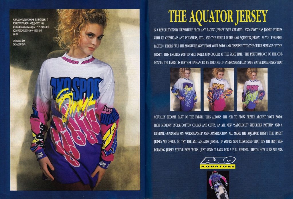 Blaze: In 1992, AXO introduced an all-new jersey to fight the heat-stroke issues caused by their Gelprints. The new Aquator jersey featured a soft cotton/Tactel construction that wicked away perspiration and actually let airflow in. I still have one of these jerseys and while it is hotter than a modern synthetic, it is about 300% cooler than a Gelprint of the era.