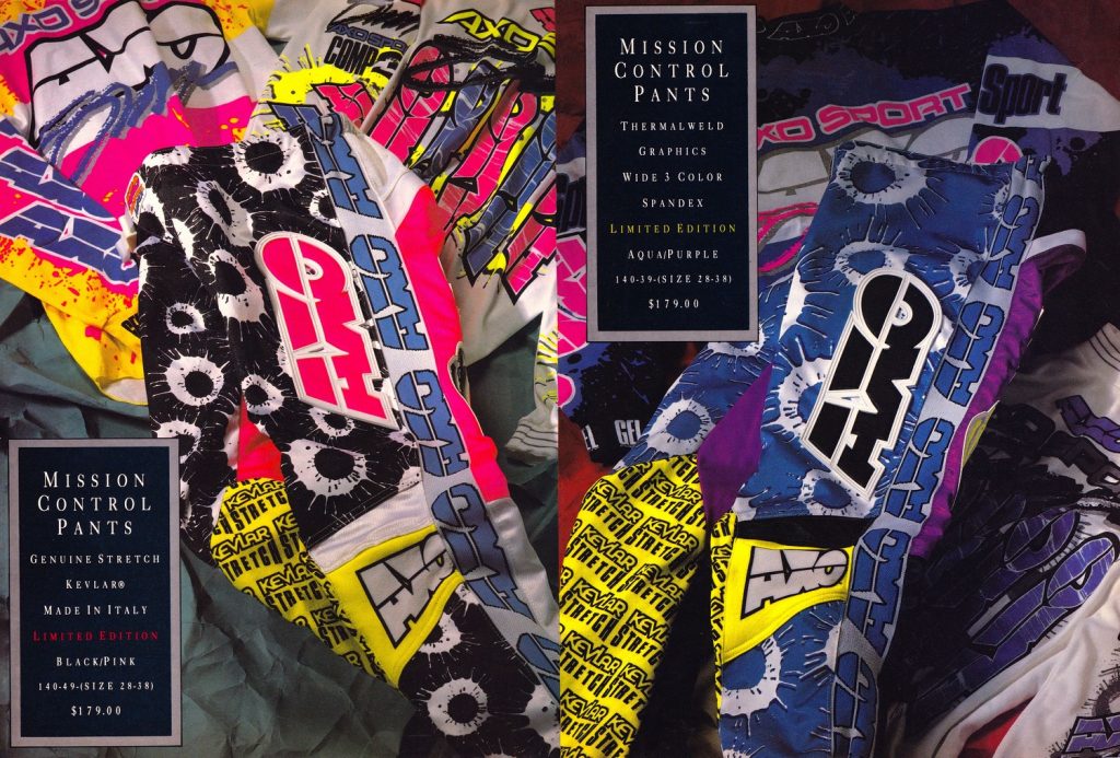 Blaze: While they were not really my cup of tea, AXO’s Limited Edition Mission Control pants certainly made quite a stir in 1991. While I did love all the color combos they came in, I never really understood the appeal of that paintball “splat” graphic. Weird visuals aside, they did have a cool new version of the AXO logo with colored biofoam inserts that were super trick.