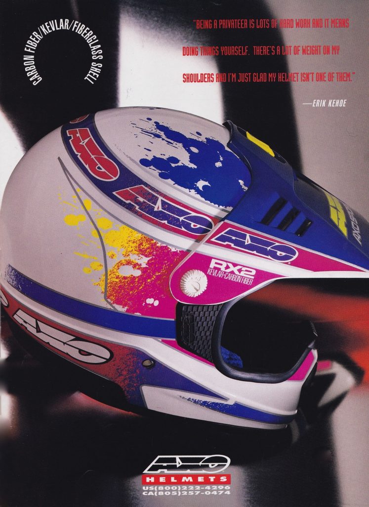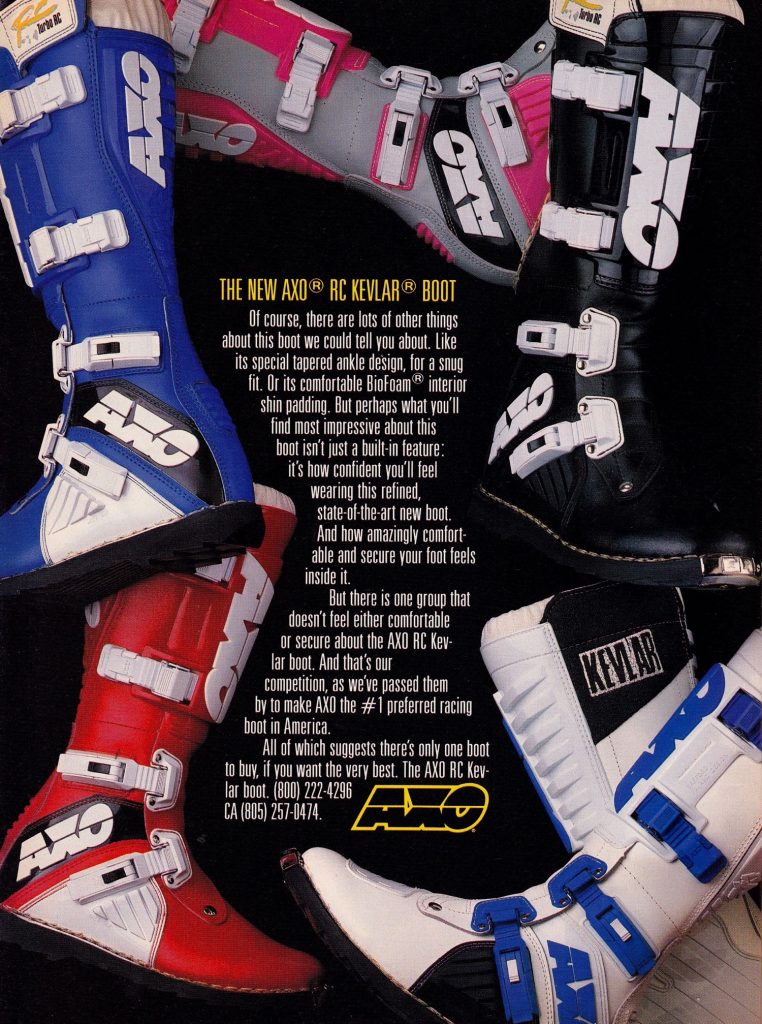 Blaze: The ’92 season was a big one for AXO, with the release of several new products and the two highest-profile riders in the sport under their tent. The new RX2 Kevlar (What the heck was it with AXO and all the Kevlar stuff in the early 90s? Did they get a deal on leftover Iran-Contra equipment from Ollie North or something?) helmet marked AXO’s first endeavor into producing a helmet.