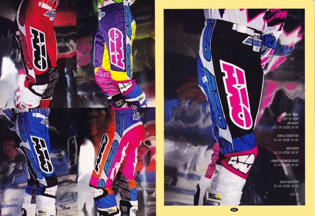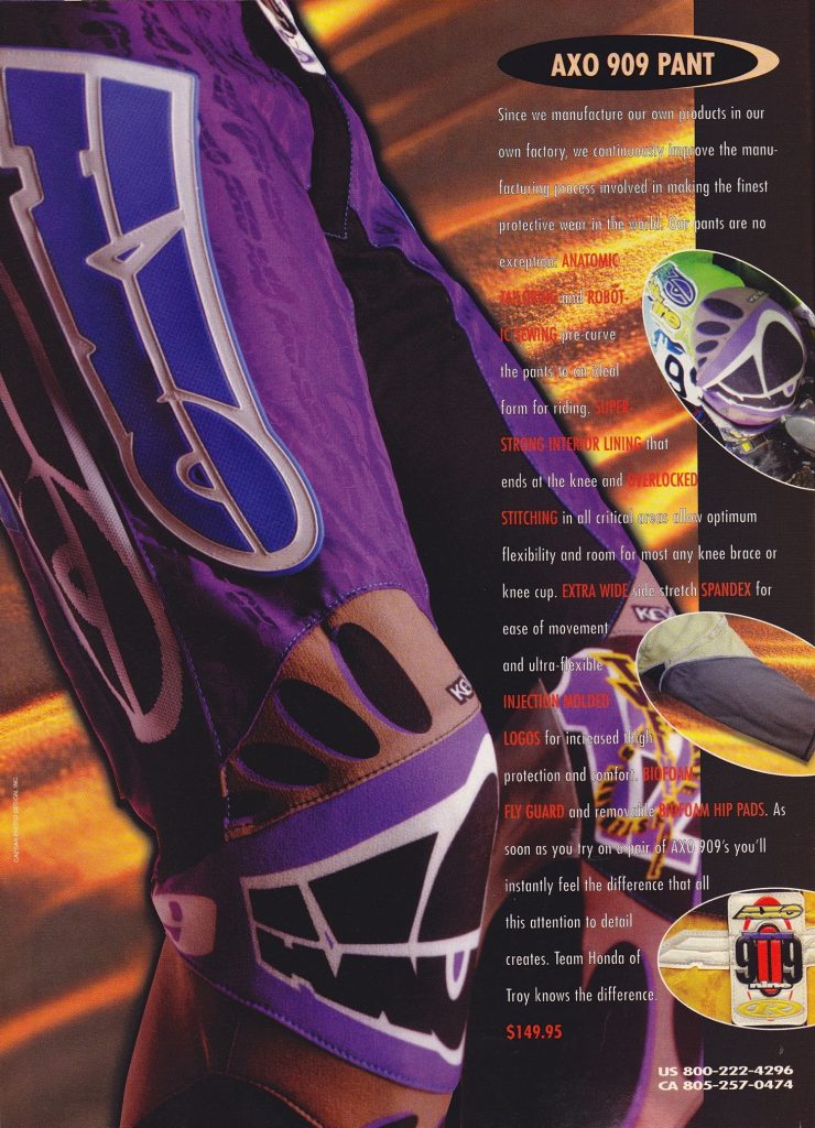Blaze: I really liked AXO’s new 909 Pant for 1995. The new logo was a bit stylized for my taste, but the overall design was clean and offered some really bright and vibrant colors. Check out all the cool little AXO logos embossed into the pants. Even those are done to match the new logo design.
