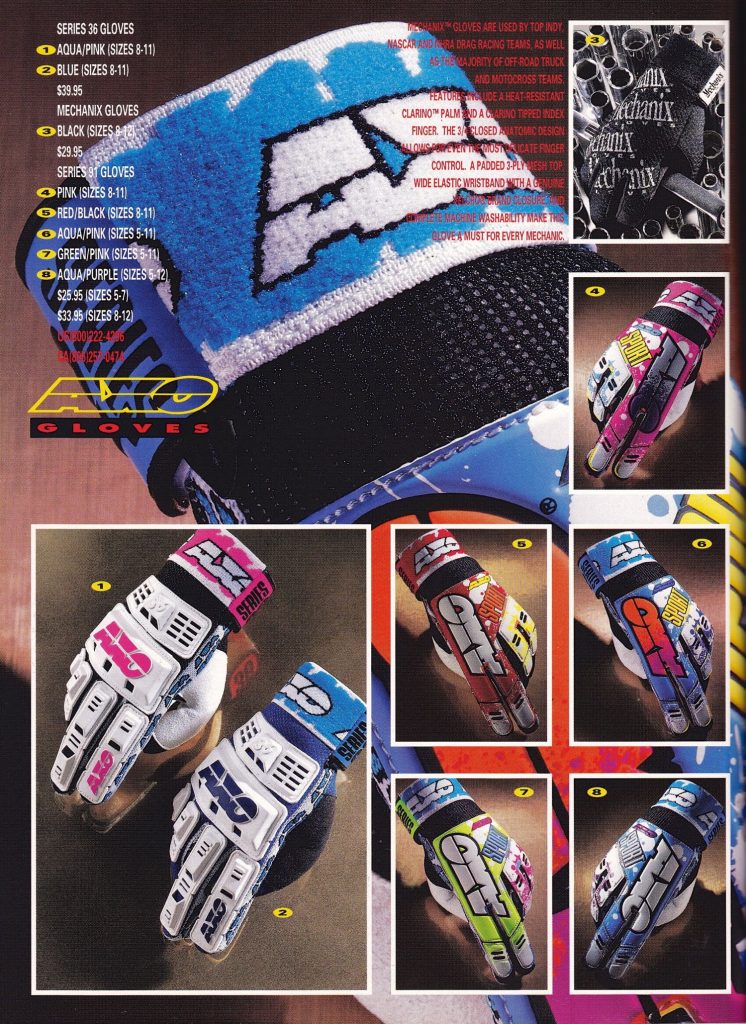 Blaze: The Series 36 was still in the lineup in 1992 and joined by a new Series 91 glove. Probably more significant than that, however, was the new mechanic-focused “Mechanix” glove in the upper right corner. Much like JT Racing and their endeavors into paintball, the success of this product would eventually lead to the demise of AXO Sport America.