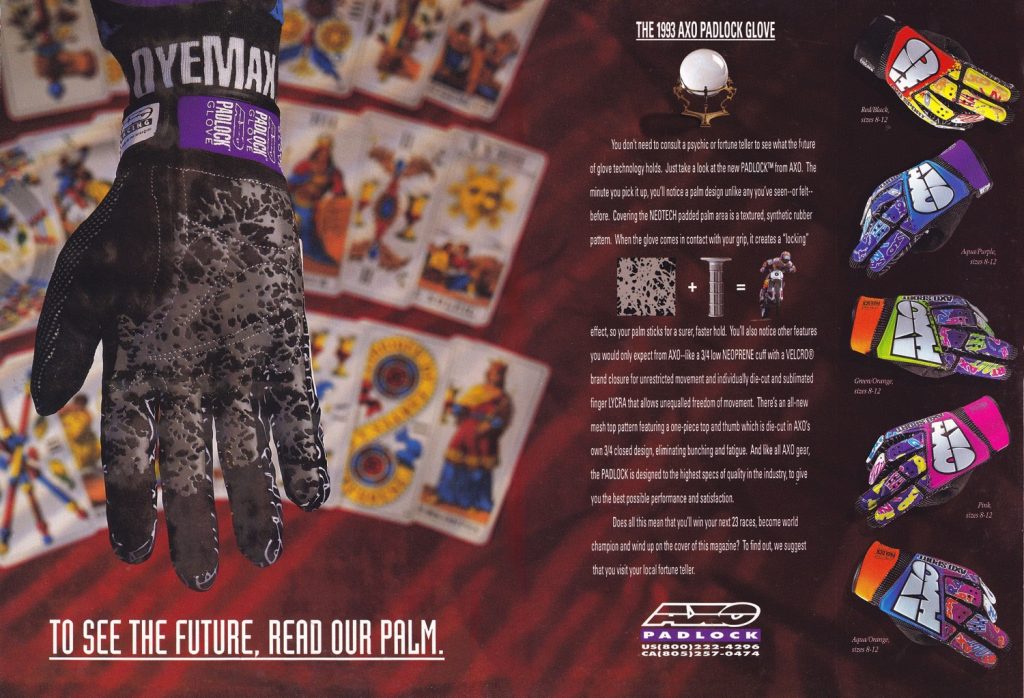 Blaze: For 1993, AXO introduced a new glove they coined the “Padlock.” These new gloves offered a unique rubberized material in the palm to “lock” your hand to the grip. While this never really took off in a big way, you do still see modern gloves use something similar in strategic areas like fingertips.