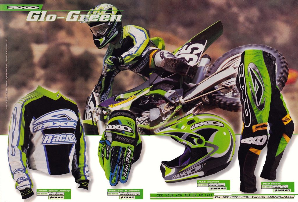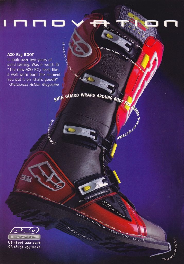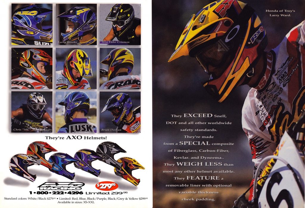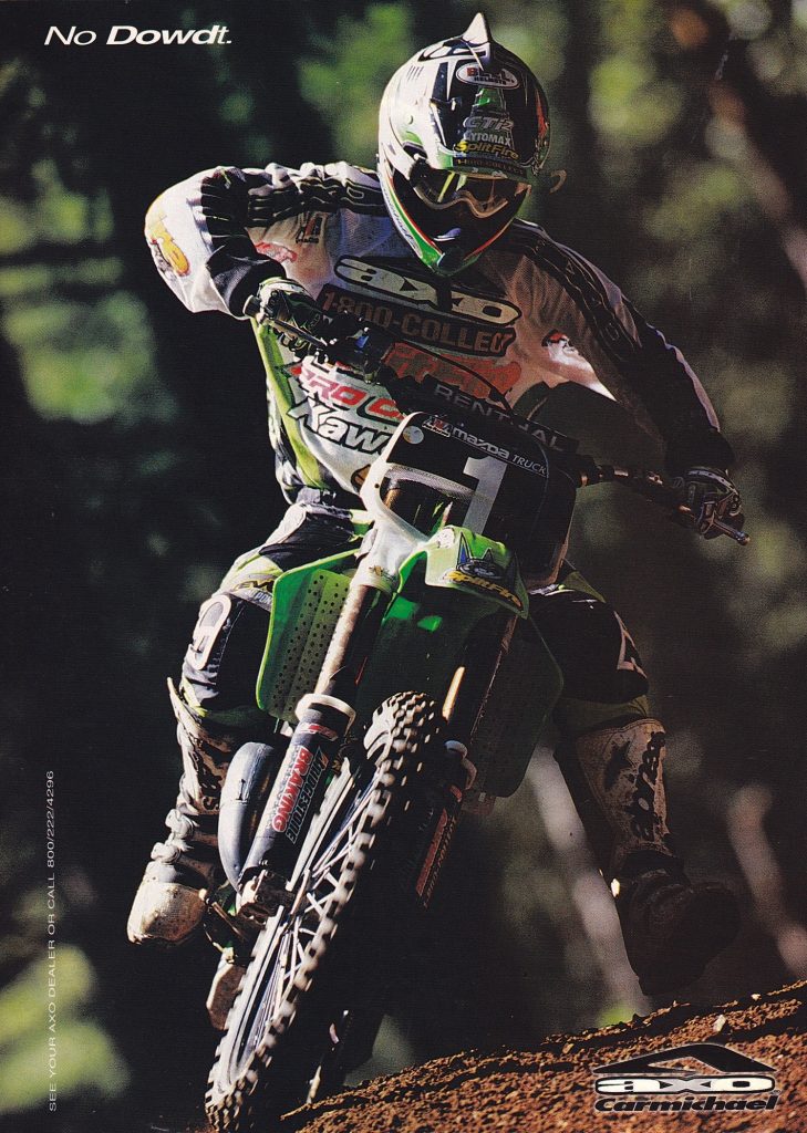 Blaze: With Bradshaw’s second retirement in 1998, 125 National Motocross champ Ricky Carmichael became AXO’s highest-profile rider. As a side note, I am not a fan of the dig at one of my favorite riders, John Dowd in the ad’s copy. The “ No Dowdt” tag line is clever, but not particularly classy in my opinion.