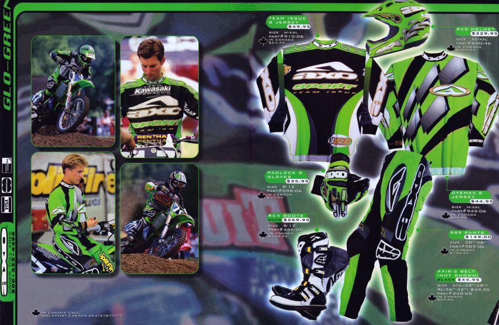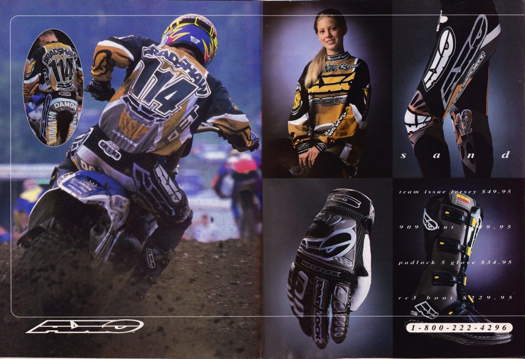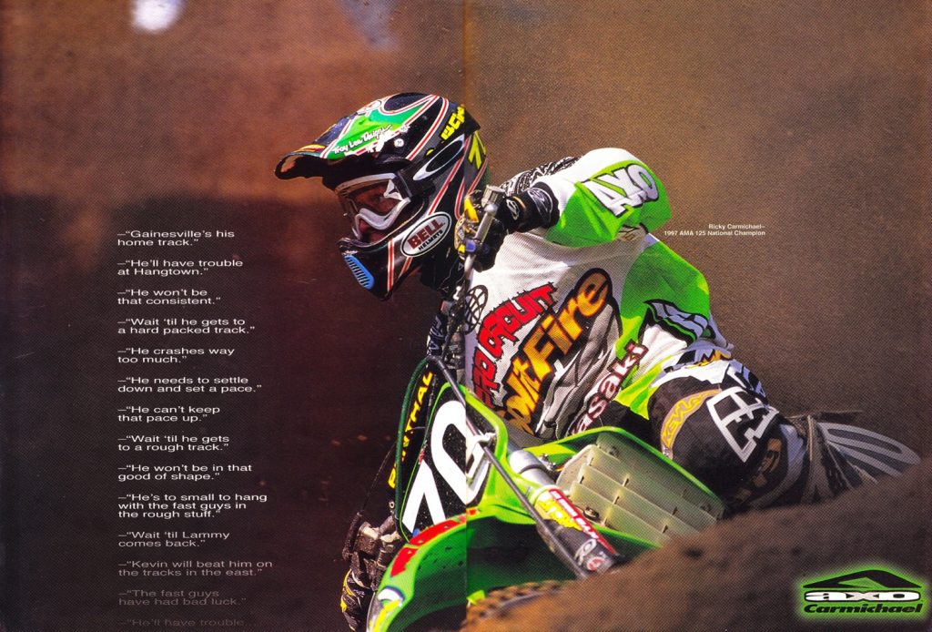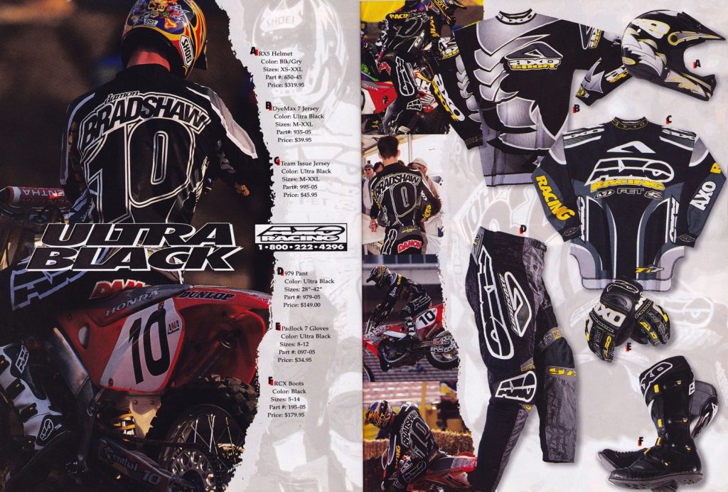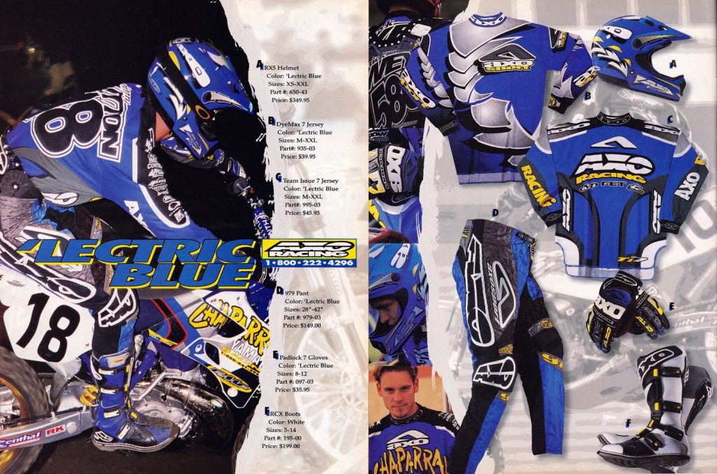 Blaze: With Bradshaw’s second retirement in 1998, 125 National Motocross champ Ricky Carmichael became AXO’s highest-profile rider. As a side note, I am not a fan of the dig at one of my favorite riders, John Dowd in the ad’s copy. The “ No Dowdt” tag line is clever, but not particularly classy in my opinion.