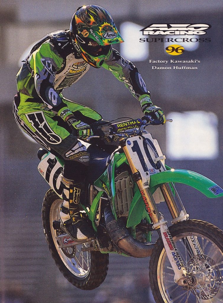 Blaze: After the exciting return of Bradshaw in 1995, AXO was dealt a major blow by Yamaha’s decision to employ Fox Racing as its official gear sponsor for 1996. This meant The Beast was unable to run AXO for the first time since his switch in 1991. Damon Huffman (pictured) and Ezra Lusk would be AXO’s big-name riders in ’96.