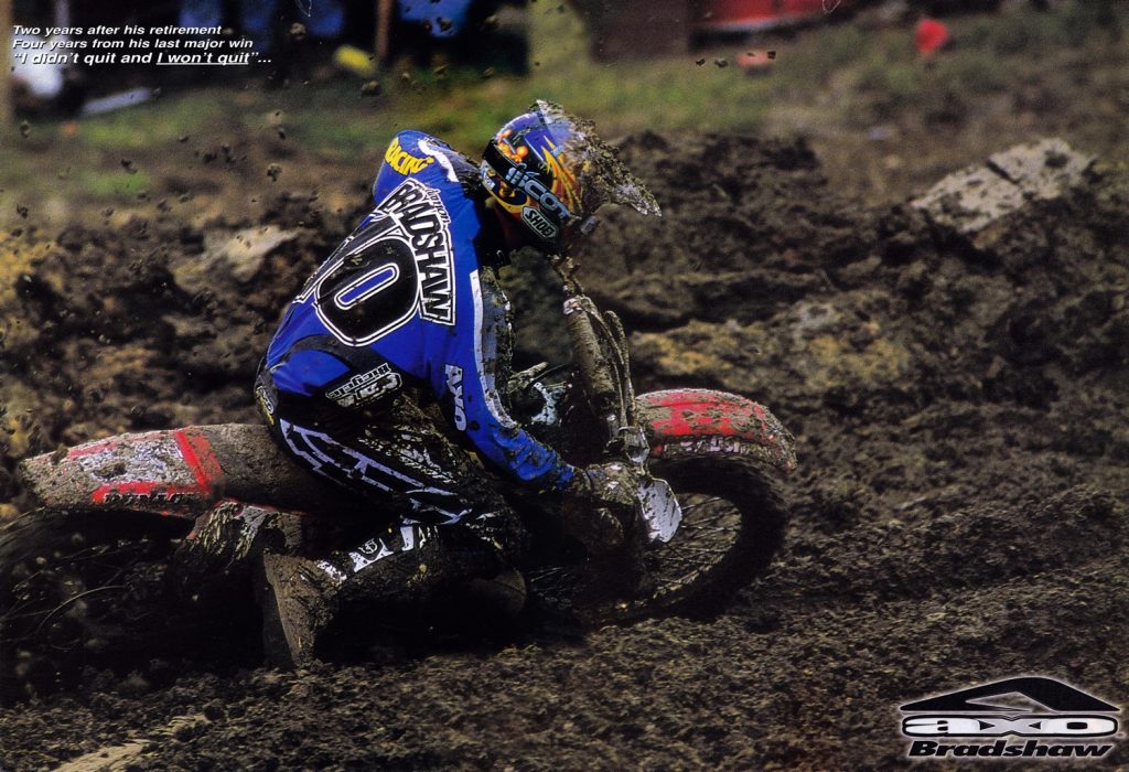 Blaze: After a brief stint in Fox, The Beast was off the Factory Yamaha team and back in AXO for 1997. Quite frankly, if not for AXO and Jim Hale, Bradshaw might not of even been racing this year. His deal with Manchester Honda was largely funded by Hale, with AXO providing the team’s hauler and most of the money for support. Damon would pay Hale back in May with a hugely popular win in the High Point mud.