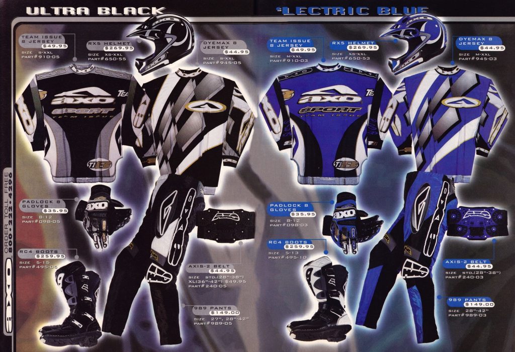 Blaze: For 1998, you can see that AXO was all-in on the new logo. Interestingly, the Axis-2 belt is still in the lineup, but I have no idea if anyone was still buying it. I was never a fan of AXO’s new logo, but the simple colorways were clean and good-looking.